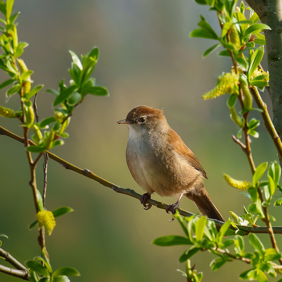Maar deze keer had ik geluk! Hij koos een bepaald boompje uit waar hij, lekker in het ochtendzonnetje, even ‘in beeld’ zittend, z’n zang de wereld in knalde, om daarna weer snel het riet in te duiken. Maar ik zag dat hij eigenlijk steeds weer terugkeerde naar hetzelfde boompje en het geheel herhaalde. Dus gewacht tot hij weer tevoorschijn kwam, om te proberen hem mooi op de foto te krijgen, voordat hij weer zou wegvliegen. Dat bleek toch lastig. Heel vaak zat hij toch nog op en tussen de takken met blaadjes of net achter de stam van het boompje. Maar de aanhouder wint! Op een gegeven moment kwam hij vol in beeld!