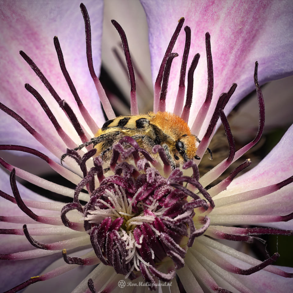 Terwijl ik wat bijtjes en vliegjes in de tuin aan het fotograferen was fladderde er ineens een geelbruin geval om me heen en dook in de Clematisbloemen. Bij nadere bestudering bleek dit te gaan om een Penseelkever (Trichius fasciatus), een prachtige okerkleurig behaarde kever, ik denk ongeveer 1,5 cm. Naast die beharing hebben ze gele rugschilden met 3 typische zwarte vlekken, hoewel daar wel veel variatie in is, er zijn zelfs geheel zwarte exemplaren waargenomen.
