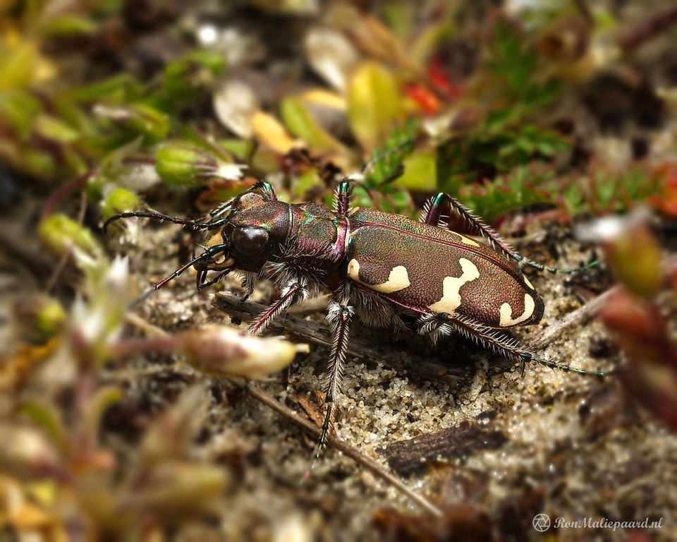 Eerder zag ik al een groene zandloopkever, nu streek zijn neefje, de basterdzandloopkever of bronzen zandloopkever (Cicindela hybrida), bij mij neer. Het is een van de circa 5 soorten die in de Benelux voorkomen. Ook deze soort is een felle rover, zowel de volwassene kever als de larve hebben ook nu weer grote kaken. De plek waar ik ‘m vond was een warme zanderige omgeving van de Voornse duinen met wat spaarzame begroeiing. De groene zandloopkever heeft een mooie groene kleur, deze basterdzandloopkever is ook mooi, maar meer bruin met een soort van parelmoerglans en wit/gelig grillig gevormde vlekken op de dekschilden. Ook bij deze soort vallen de enorme ogen en kaken op.