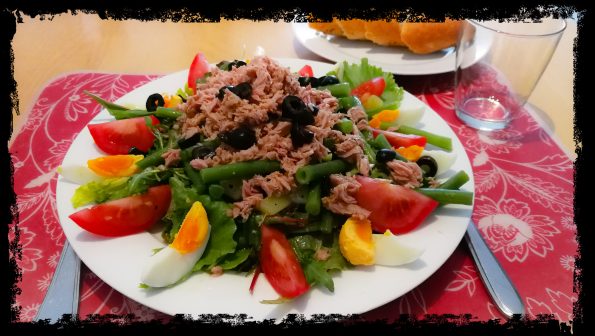 - Vervolgens leg je daar de tonijn, het ei, de zwarte olijven en eventueel de aardappel op.