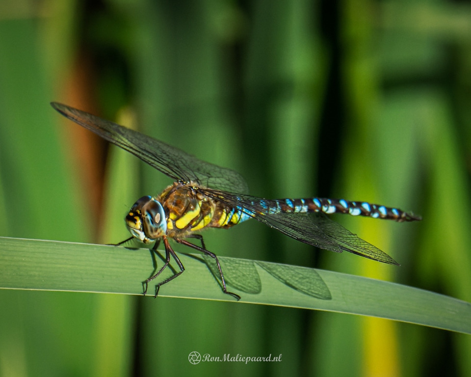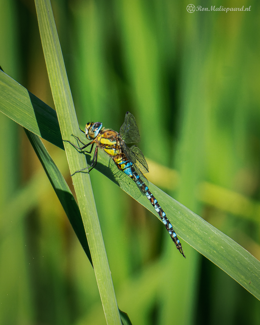 In dit geval kwam ik een Paardenbijter (Aeshna mixta) tegen die tussen het riet aan het patrouilleren was. Ik wachtte rustig en bestudeerde zijn (want man) bewegingen. Hij deed zoals veel libellen doen: rondjes vliegen en van een aantal ‘vaste’ zitplekken het territorium in de gaten houden. Op een gegeven moment zag ik dat hij steeds weer terugkwam op een aantal plekken en heb me daarop geconcentreerd (en alvast ‘voor’ scherp gesteld). En toen hij ging zitten op een van die plekken was het al snel raak. Ik heb zo aardig wat foto’s geschoten waar ik tevreden over was.