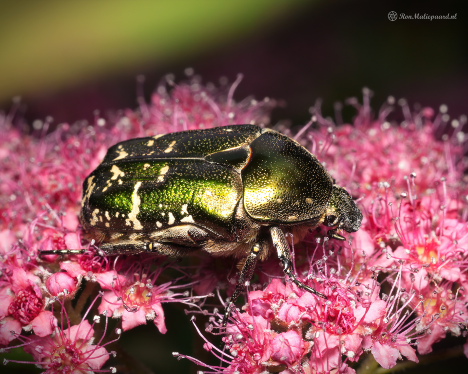 In de heemtuin in Nunspeet zag ik een paar mooie grote torren met prachtige groen/brons metallic kleuren. Maar welke tor het precies is weet ik niet. In eerste instantie zou ik direct zeggen dat het een gouden tor (Cetonia aurata) is, maar een zeer sterk op de gouden tor lijkende soort is de gedeukte gouden tor (Protaetia metallica). Die zou meer algemener zijn dan de gouden tor.