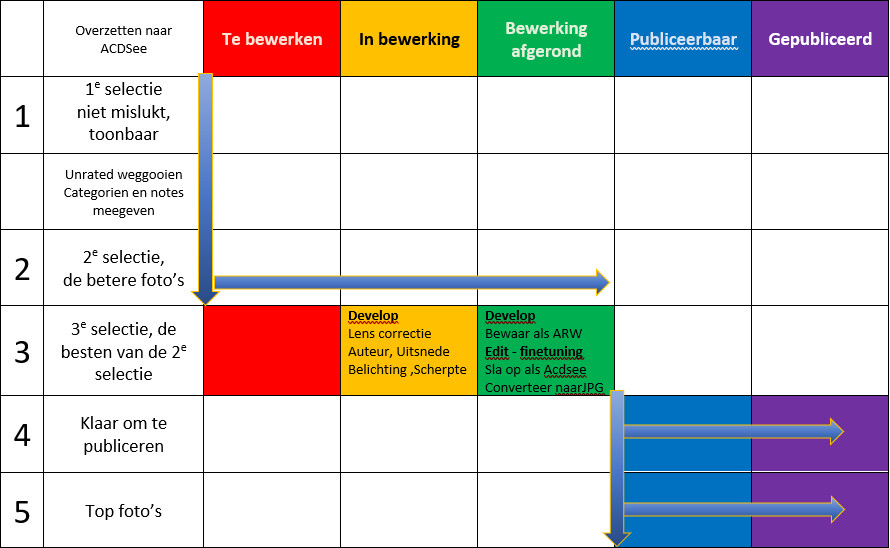 Onderstaande flow geeft aan hoe ik gebruik maak van de rating mogelijkheden (cijfers en kleuren) in ACDSee Photo Studio Ultimate 2020: