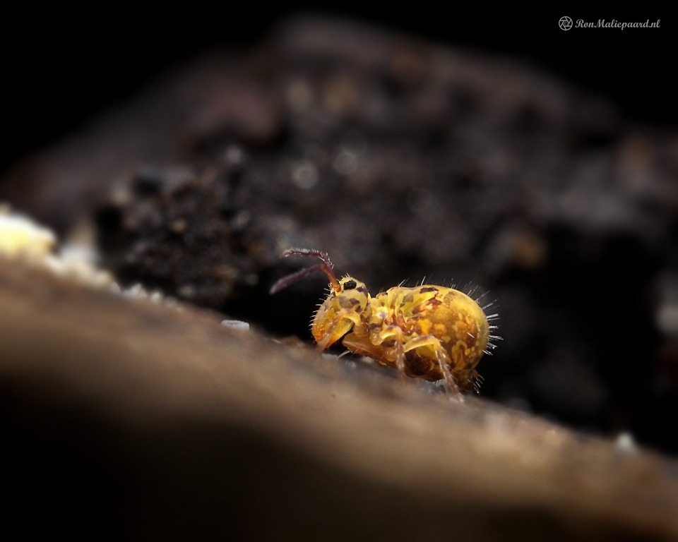 Een veel gefotografeerd onderwerp, maar deze stond nog op mijn To Do lijstje. Totdat ik een miljoenpoot aan het fotograferen was. Ineens zie ik een oranje bolletje van nog geen 2 mm rondlopen. Het was een van de vele soorten springstaarten, de Dicyrtomina ornata. Helaas voor de miljoenpoot, de springerstaart kreeg even voorrang.